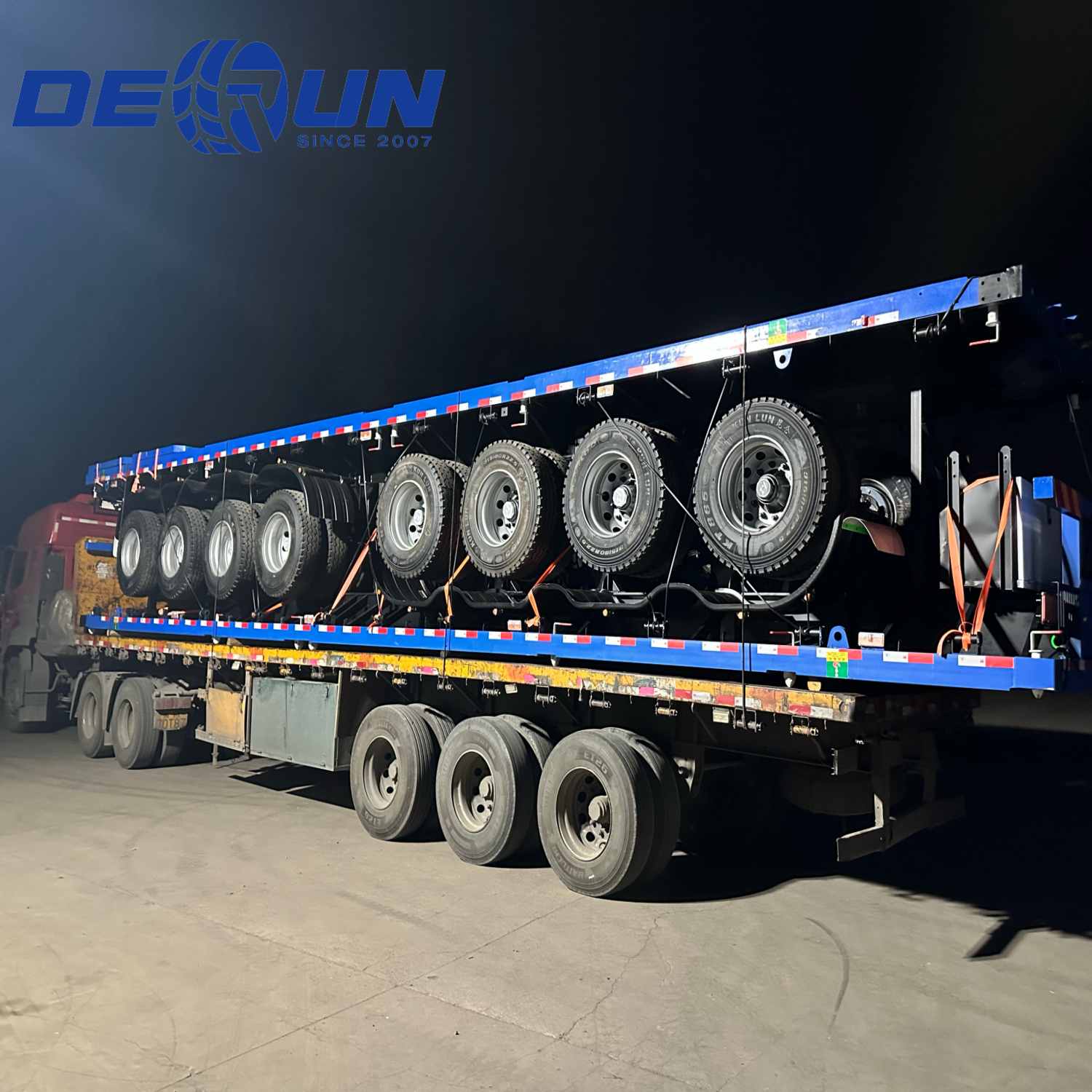 Przybył, aby sprawdzić 4 -osiowy pół -płaski przyczepę, którą zamówił od nas, która już zapakowała się w naszej fabryce i gotowa do portu. Aby obniżyć koszty wysyłki, ułożyliśmy razem dwie 4 osi półtory płaskich.